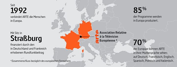 ARTE: Association relative à la télévision européenne ('Zusammenschluss bezüglich des europäischen Fernsehens') Seit 1992 verbindet ARTE die Menschen in Europa. Mit Sitz in Straßburg, finanziert durch den in Deutschland und Frankreich erhobenen Rundfunkbeitrag 85 % der Programme werden in Europa produziert. 70 % der Europäer können ARTE in ihrer Muttersprache sehen: auf Deutsch, Französisch, Englisch, Spanisch, Polnisch und Italienisch.