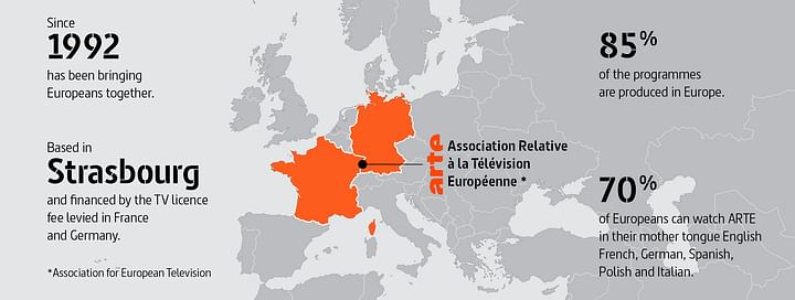 ARTE: Association relative à la télévision européenne ('Association for European Television') Since 1992 ARTE has been bringing Europeans together. Based in Strasbourg and financed by the TV licence fee levied in France and Germany. 85 % of the programmes are produced in Europe. 70 % of Europeans can watch ARTE in their mother tongue French, German, English, Spanish, Polish and Italian.