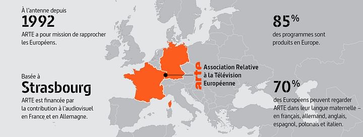 ARTE: Association relative à la télévision européenne. À l'antenne depuis 1992, ARTE a pour mission de rapprocher les Européens. Basée à Strasbourg, ARTE est financée par la contribution à l'audiovisuel en France et en Allemagne. 85 % des programmes sont produits en Europe. 70 % des Européens peuvent regarder ARTE dans leur langue maternelle – en français, allemand, anglais, espagnol, polonais et italien.