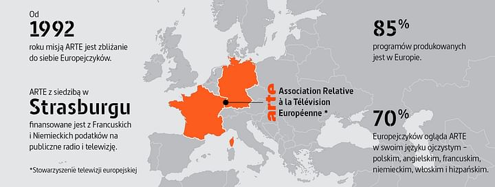 ARTE: Association relative à la télévision européenne ('Stowarzyszenie telewizji europejskiej') Od 1992 roku misją ARTE jest zbliżanie do siebie Europejczyków. ARTE z siedzibą w Strasburgu finansowane jest z Francuskich i Niemieckich podatków na publiczne radio i telewizję. 85 % programów produkowanych jest w Europie. 70 % Europejczyków ogląda ARTE w swoim języku ojczystym − polskim, angielskim, francuskim, niemieckim, włoskim i hizpańskim.